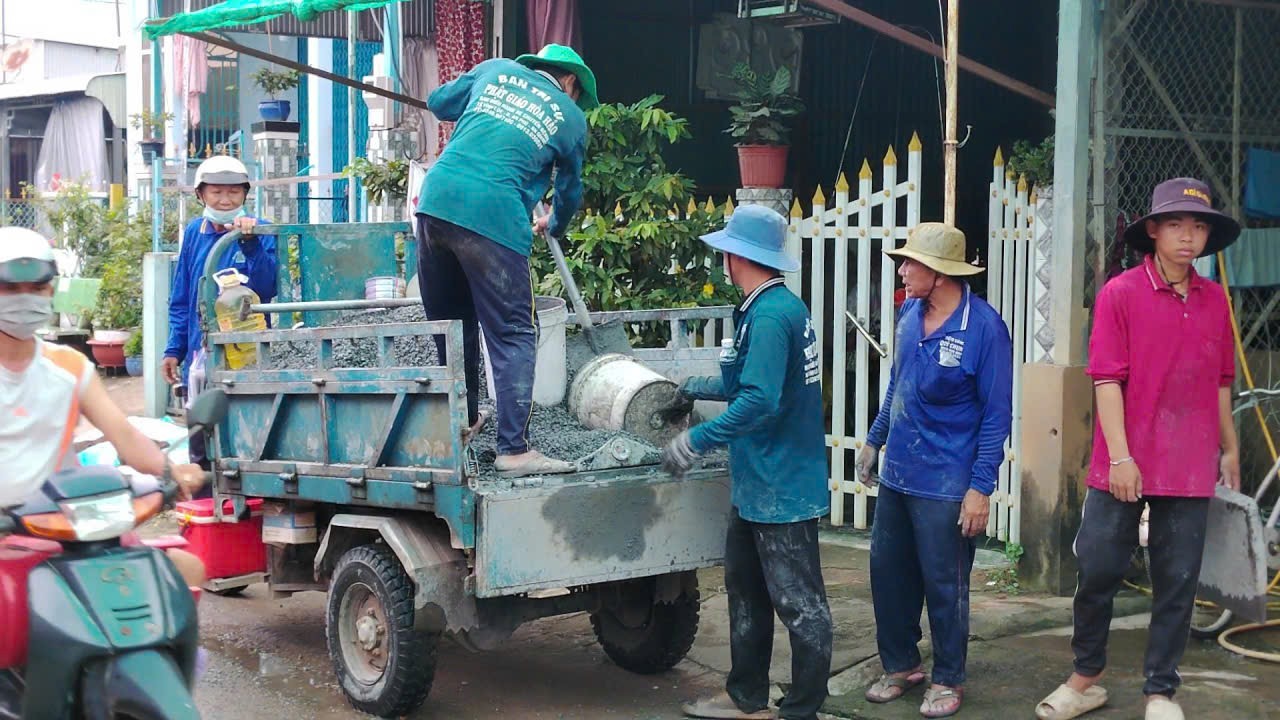 Thành viên Đội tu sửa đường Ban Trị sự PGHH Vĩnh Lộc, xã Phú Hữu thực hiện các công đoạn dặm vá các đoạn lộ nông thôn bị hư hỏng