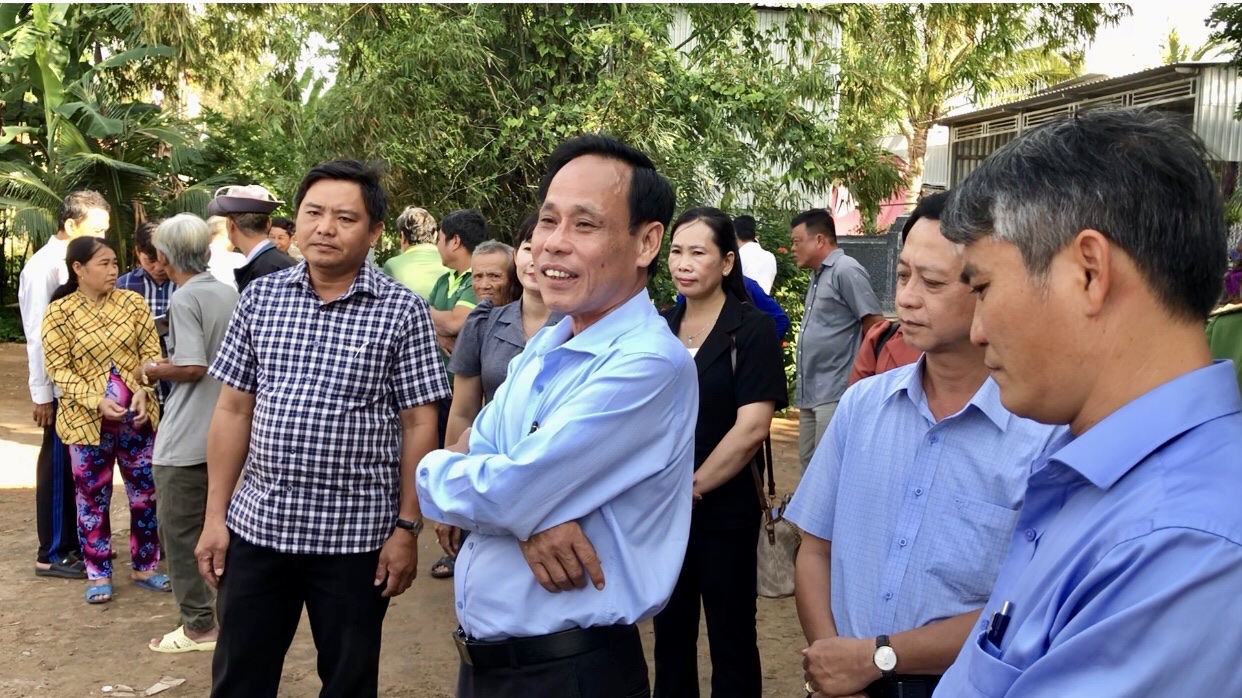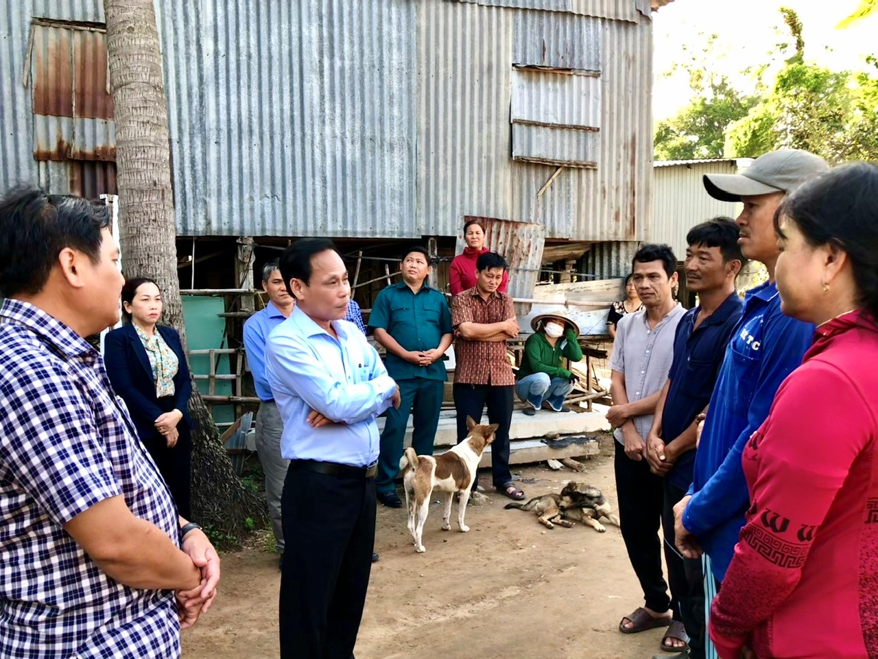 Đoàn công tác xã Vĩnh Xương và lãnh đạo xã Phú Hữu chia sẻ khó khăn với các hộ dân