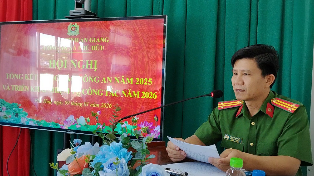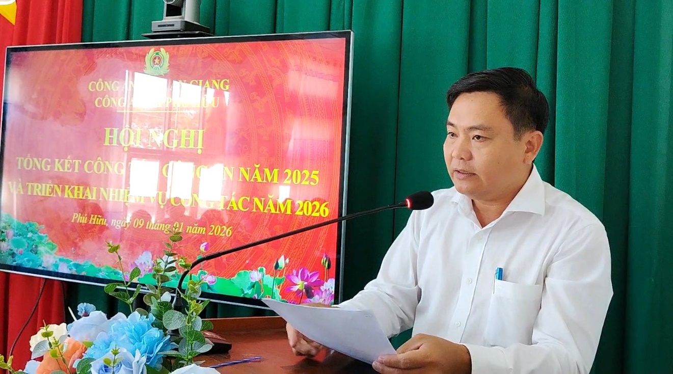 Định hướng các nhiệm vụ trọng tâm thực hiện công tác Công an năm 2026, phát biểu tại hội nghị, Thượng tá Huỳnh Bảo Trúc, Phó Trưởng phòng PA01-Công an tỉnh An Giang đề nghị Công an xã Phú Hữu làm tốt công tác nắm, dự báo về tình hình đảm bảo an ninh quốc gia để kịp thời tham mưu cho cấp ủy, chính quyền và ngành cấp trên; tiếp tục đẩy mạnh công tác cải cách hành chính, chuyển đổi số và tham mưu tốt công tác quản lý nhà nước về an ninh trật tự…