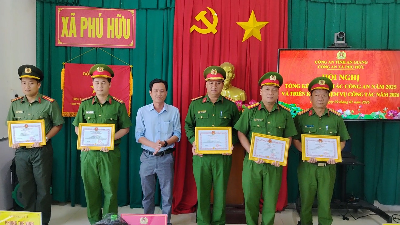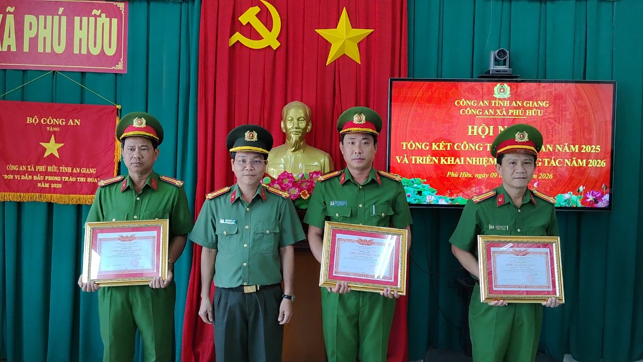 Dịp này, có 9 cá nhân đạt danh hiệu Chiến sĩ thi đua cơ sở đã có thành tích xuất sắc trong phong trào thi đua “Vì an ninh Tổ quốc” năm 2025 được Giám đốc Công an tỉnh An Giang khen thưởng; 17 cá nhân có thành tích xuất sắc trong phong trào “Toàn dân bảo vệ an ninh Tổ quốc” năm 2025 được UBND xã Phú khen thưởng.