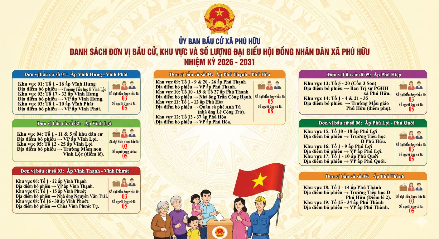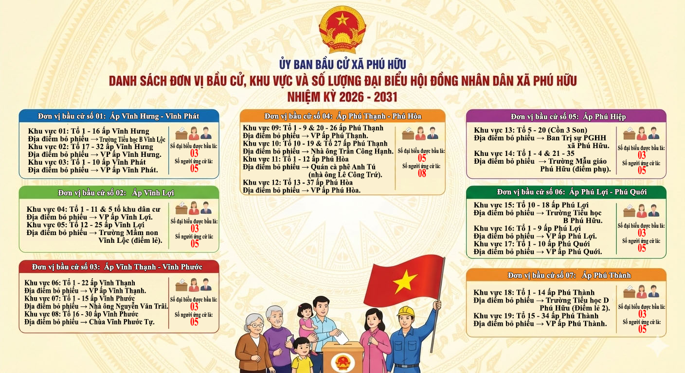 DANH SÁCH ĐƠN VỊ BẦU CỬ, KHU VỰC, ĐỊA ĐIỂM VÀ SỐ LƯỢNG ĐẠI BIỂU HỘI ĐỒNG NHÂN DÂN XÃ PHÚ HỮU NHIỆM KỲ 2026 - 2031