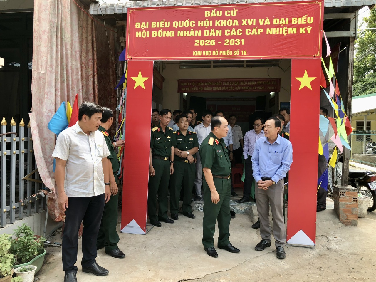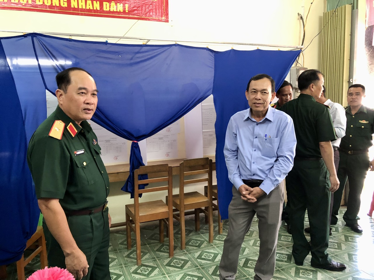 Thiếu tướng Nguyễn Văn Ngành, Ủy viên Ban Thường vụ Tỉnh ủy, Chỉ huy trưởng Bộ CHQS tỉnh (bìa phải) kiểm tra công tác bố trí các bước tại Khu vực bỏ phiếu số 16