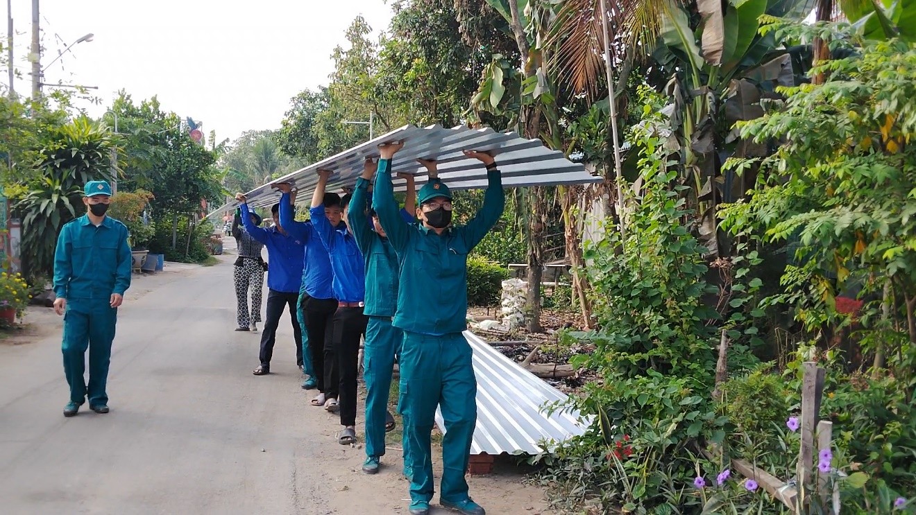Đoàn viên, thanh niên xã Phú Hữu vận chuyển từng tấm tôn mới