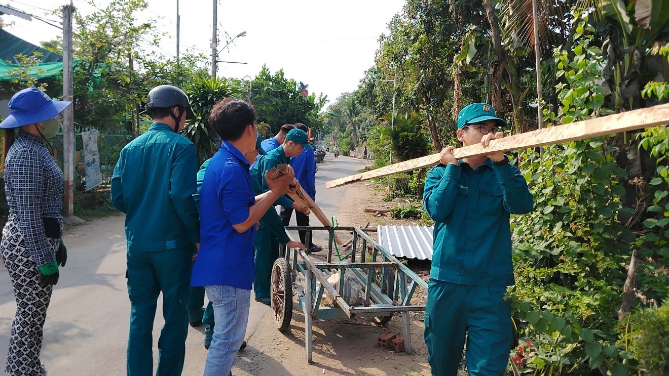 Đoàn viên, thanh niên xã Phú Hữu vận chuyển cây chuẩn bị cho công đoạn lợp mái nhà mới