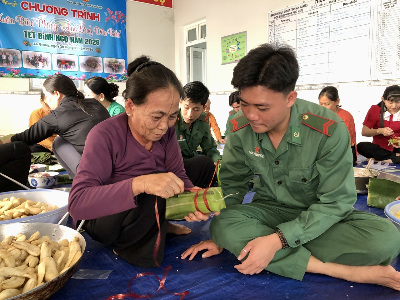Nằm trong chuỗi hoạt động của chương trình “Xuân Biên phòng ấm lòng dân bản” Tết Bính Ngọ 2026, Đồn Biên phòng Phú Hữu đã phối hợp Trường Mẫu giáo Phú Hữu cùng phụ huynh học sinh tổ chức gói bánh tét, trao tặng cán bộ, chiến sĩ đang thực hiện nhiệm vụ bảo vệ an ninh trật tự trên địa bàn và Nhân dân địa phương nhân dịp Tết cổ truyền dân tộc.