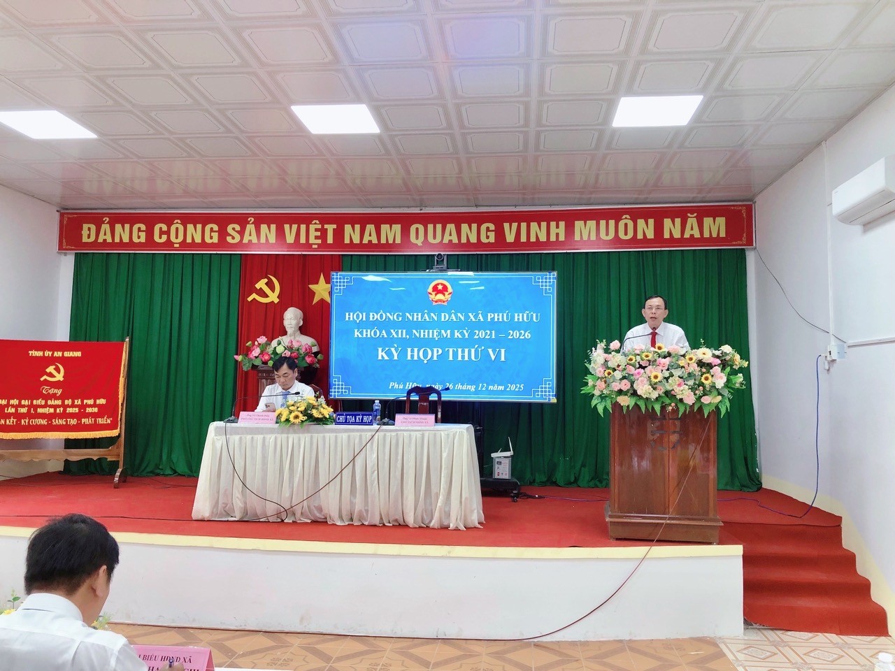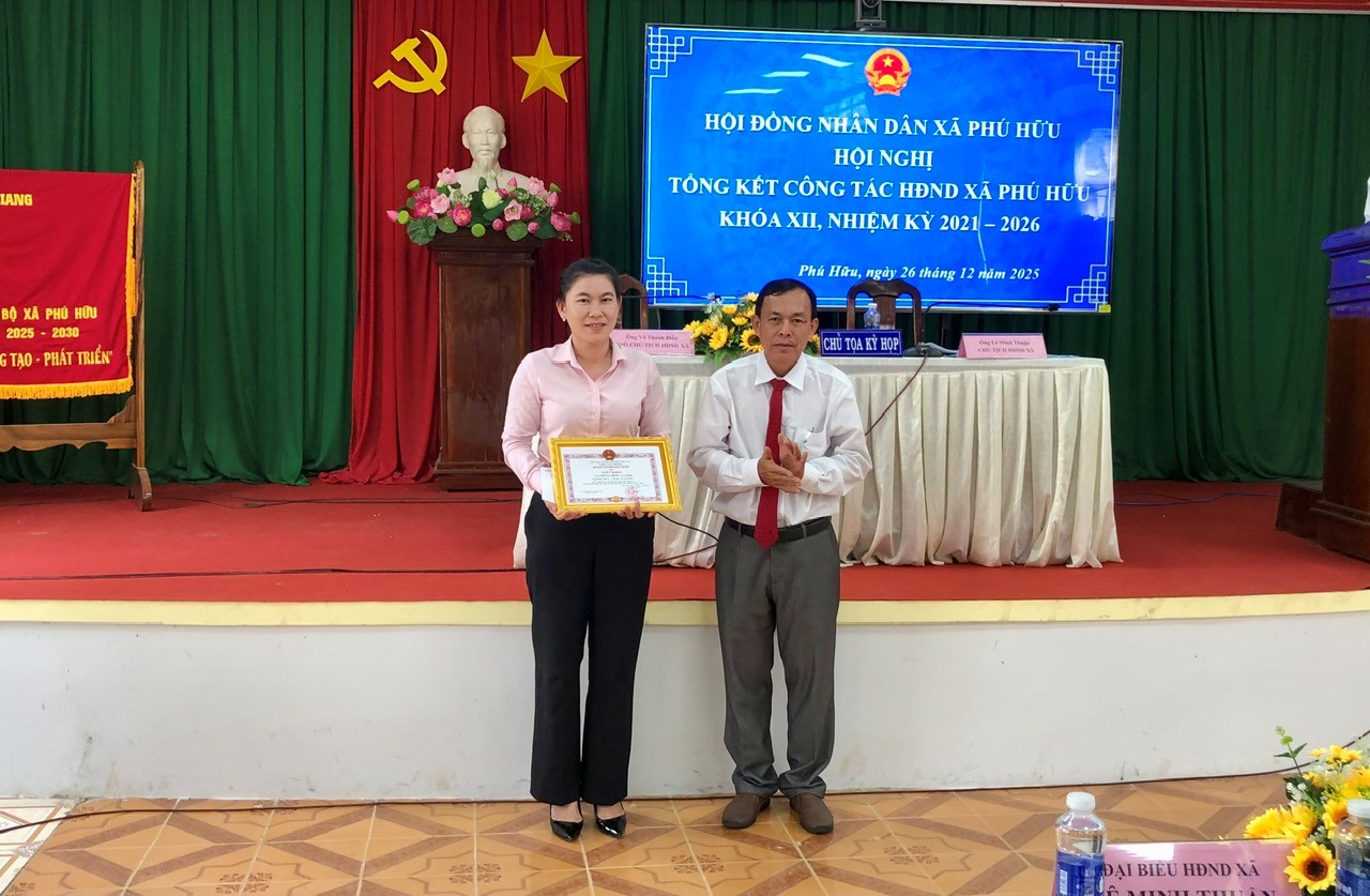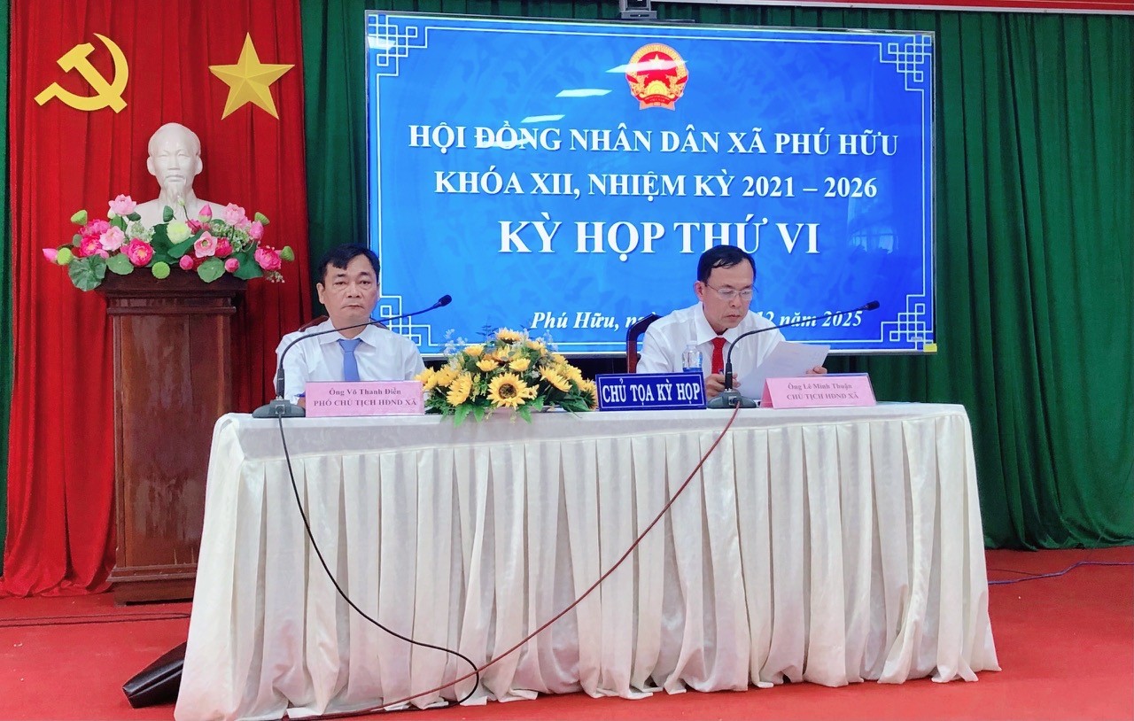 Sáng 26/12, Hội đồng nhân dân (HĐND) xã Phú Hữu tổ chức kỳ họp lần thứ VI (kỳ họp thường lệ cuối năm 2025), khóa XII, nhiệm kỳ 2021 – 2026 nhằm đánh giá tình hình thực hiện nhiệm vụ chính trị năm 2025 và xem xét, quyết định thông qua một số nội dung trọng tâm trong thời gian tới. Đồng thời tổng kết công tác hoạt động HĐND xã khóa XII, nhiệm kỳ 2021 – 2026. Ông Lê Minh Thuận, Bí thư Đảng ủy, Chủ tịch HĐND xã Phú Hữu và ông Võ Thanh Điền, Phó Chủ tịch HĐND xã cùng chủ trì kỳ họp.
