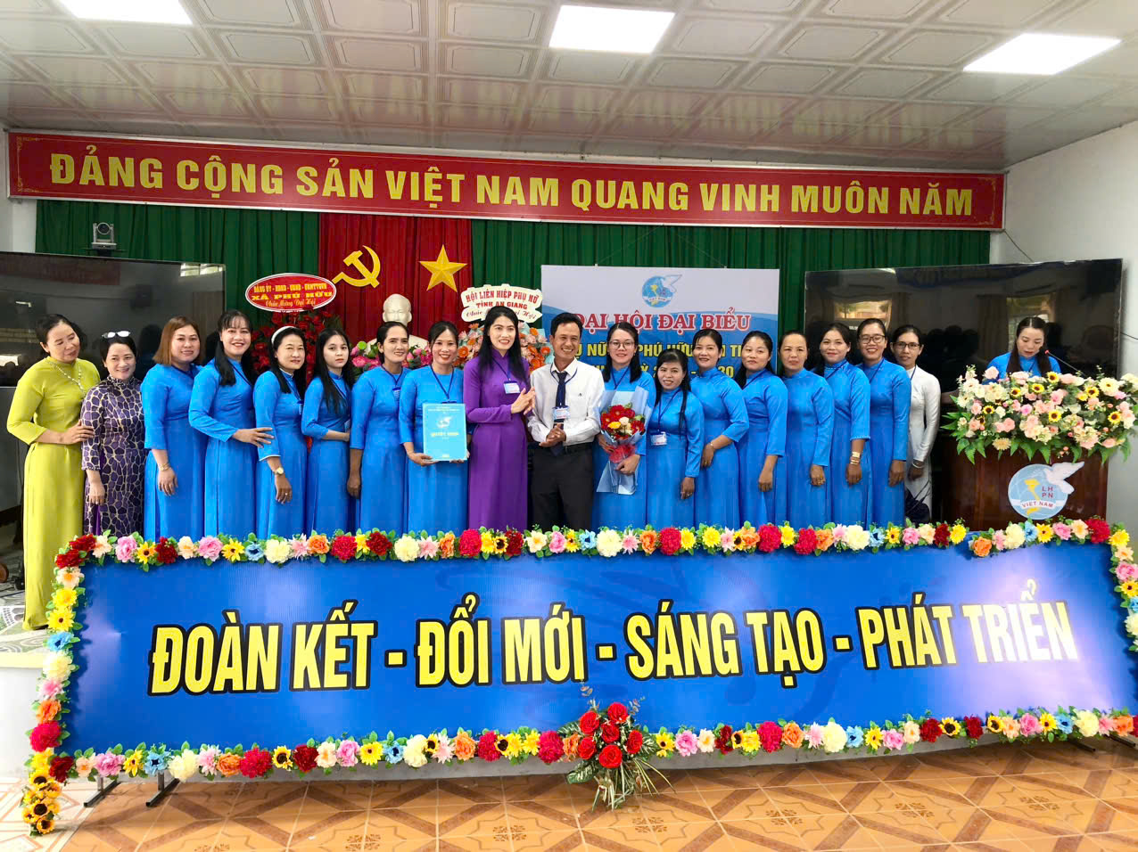 Phó Chủ tịch Thường trực Hội LHPN tỉnh An Giang Nguyễn Thị Quyến (thứ 3 từ phải sang) tặng hoa chúc mừng Đại hội