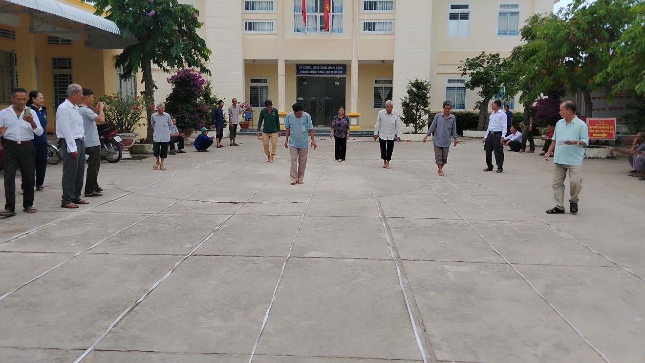 Các hội viên người cao tuổi ở các ấp tham gia trò chơi đi bộ chấm gót