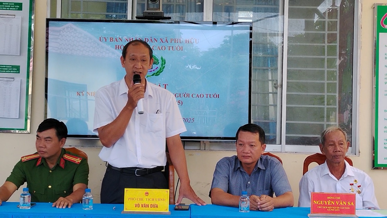 Sáng 27/9, Hội Người cao tuổi xã Phú Hữu tổ chức họp mặt kỷ niệm 34 năm Ngày Quốc tế Người cao tuổi (01/10/1991 – 01/10/2025); ông Võ Văn Dừa, Phó Chủ tịch UBND xã Phú Hữu đến dự.