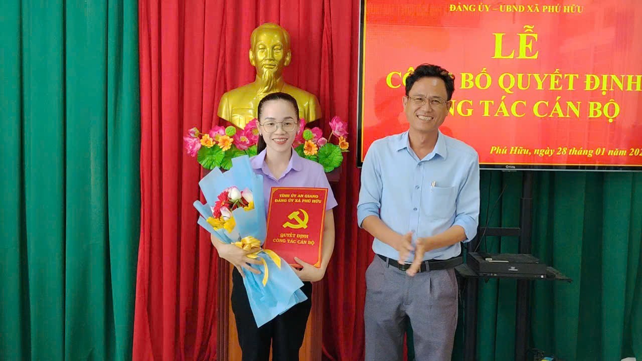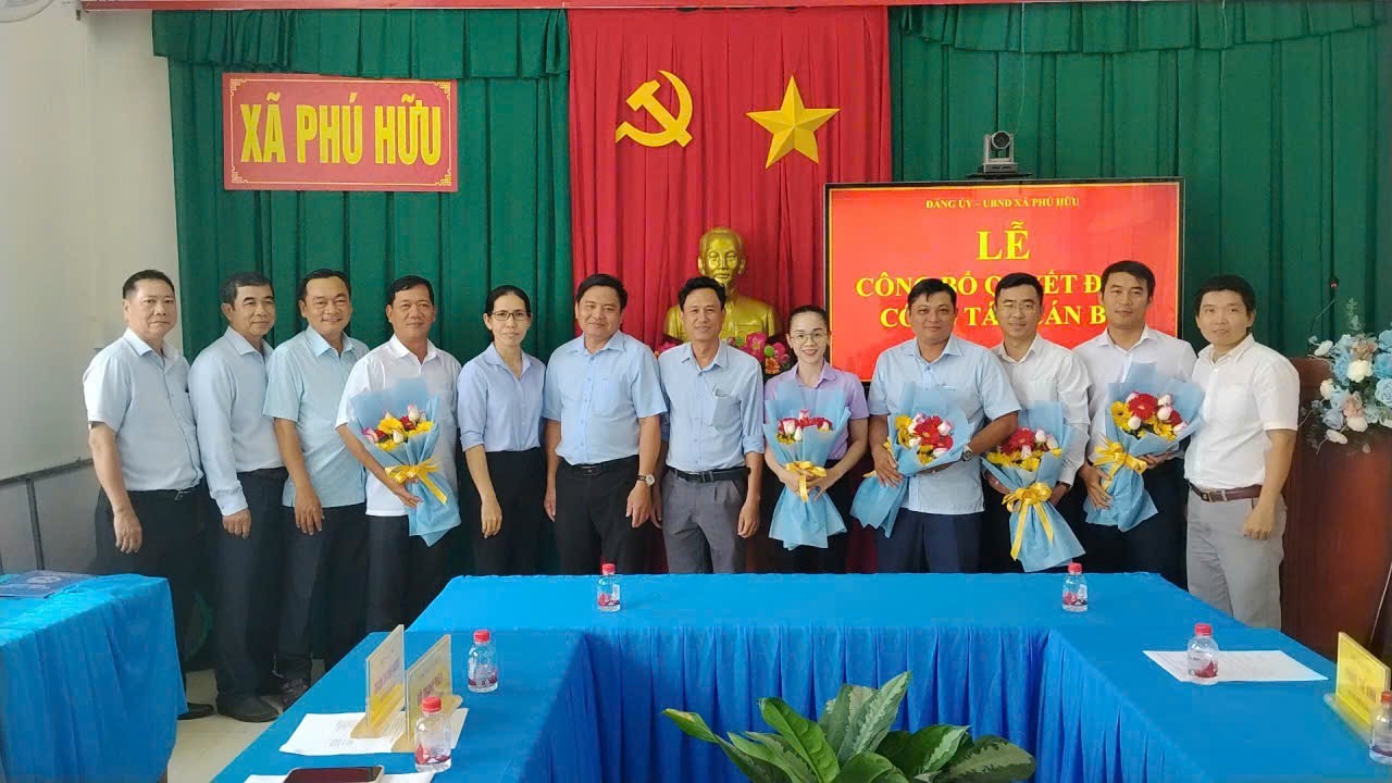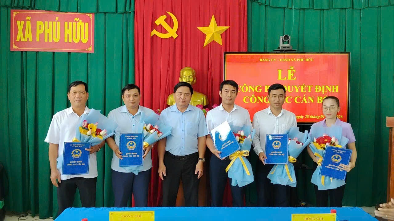 Cùng với đó, đại diện Phòng Văn hóa – Xã hội xã Phú Hữu công bố quyết định của Sở Nội vụ An Giang về điều động ông Phan Công Văn, Trưởng Phòng Kinh tế xã Phú Hữu đến nhận công tác tại UBND xã Vĩnh Hậu, nhiệm vụ cụ thể do UBND xã phân công; đồng thời, công bố các quyết định của UBND xã Phú Hữu điều động ông Phạm Tấn Tháo, Chánh Văn phòng HĐND – UBND xã đến nhận công tác tại Phòng Kinh tế, bổ nhiệm chức vụ Trưởng Phòng Kinh tế, thời hạn giữ chức vụ là 5 năm; phân công ông Lâm Thái Toàn, công chức UBND xã đến nhận nhiệm vụ tại Phòng Kinh tế xã, nhiệm vụ do lãnh đạo phân công; điều động ông Nguyễn Trung Kiên, Chuyên viên Trung tâm Phục vụ hành chính công xã đến nhận công tác tại Đảng ủy xã Phú Hữu, nhiệm vụ do Đảng ủy xã phân công; tiếp nhận và phân công bà Đinh Thị Trúc Linh, Chuyên viên Ban xây dựng Đảng đến nhận nhiệm vụ tại Phòng Kinh tế xã, nhiệm vụ vụ thể do lãnh đạo phân công.