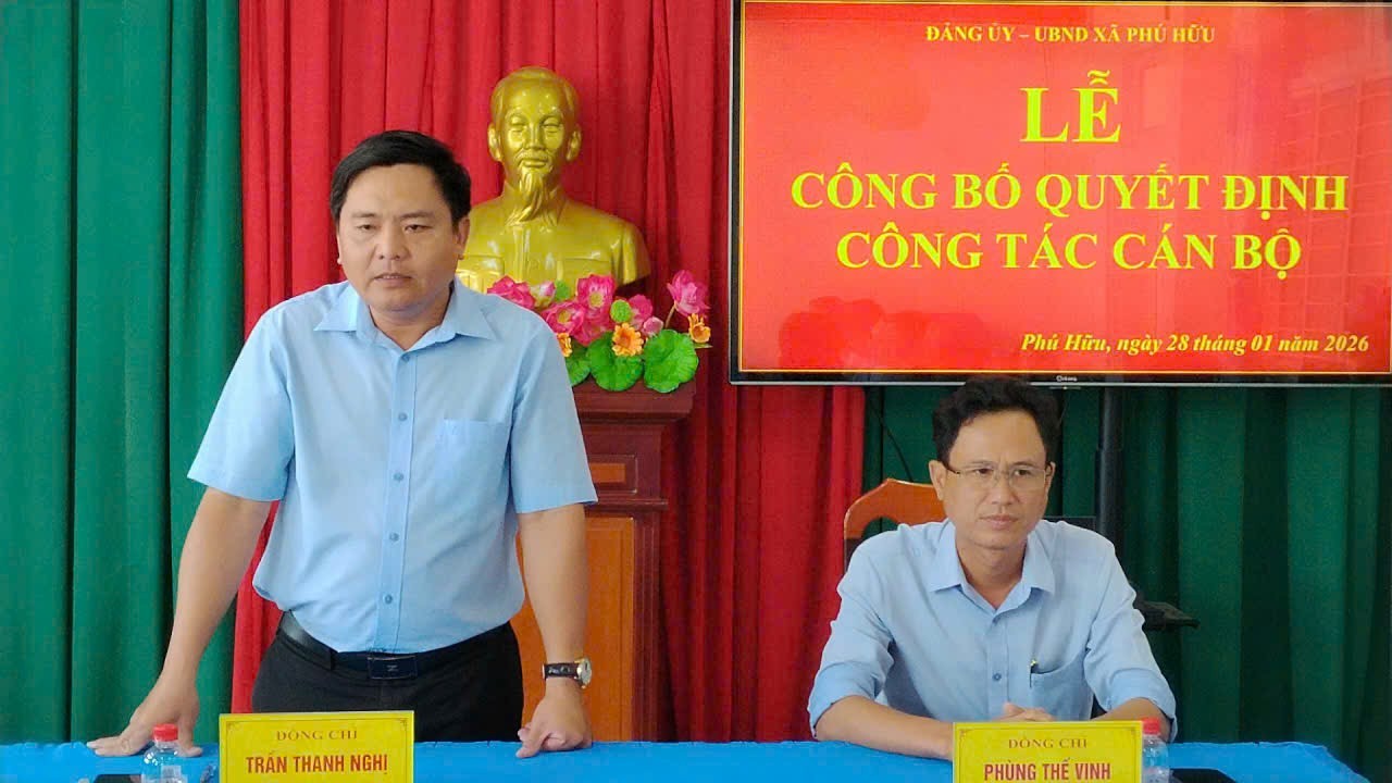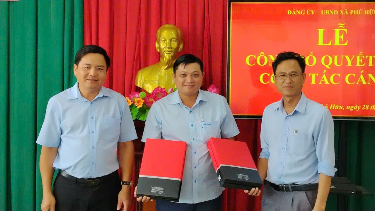 Chiều 28/1, Ban Thường vụ Đảng ủy và UBND xã Phú Hữu tổ chức lễ công bố các quyết định về công tác cán bộ. Phó Bí thư Thường trực Đảng ủy xã Phú Hữu Phùng Thế Vinh và Phó Bí thư Đảng ủy, Chủ tịch UBND xã Trần Thanh Nghị chủ trì và trao quyết định.