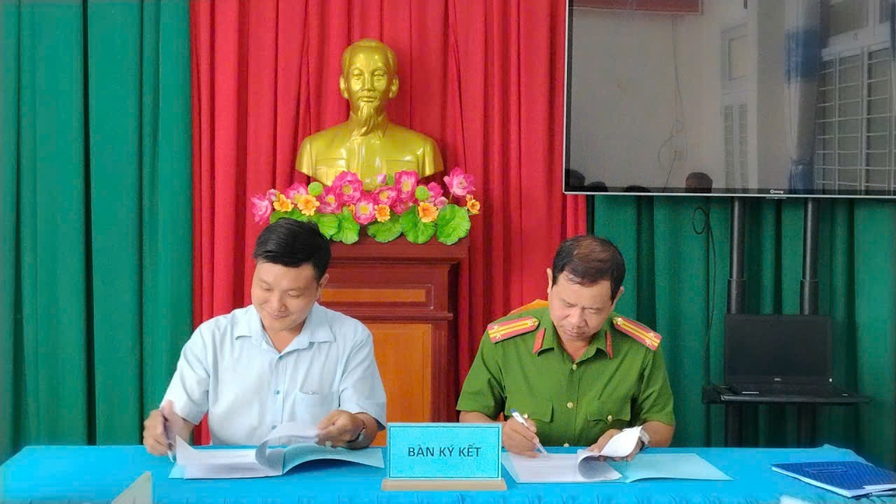 Đại diện Công an xã và Ủy ban MTTQ Việt Nam xã và các tổ chức thành viên tiến hành ký kết Chương trình phối hợp