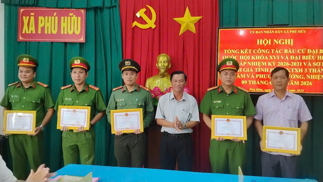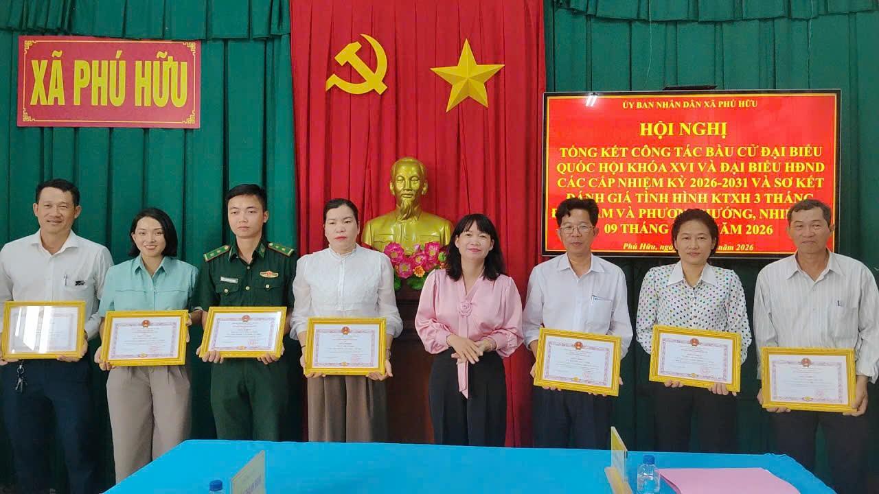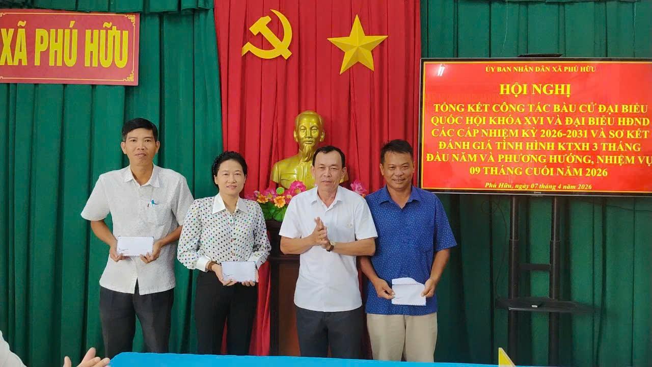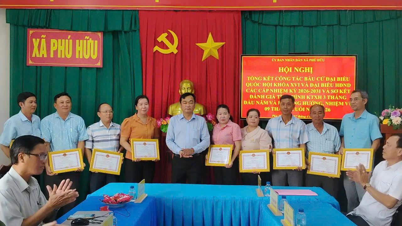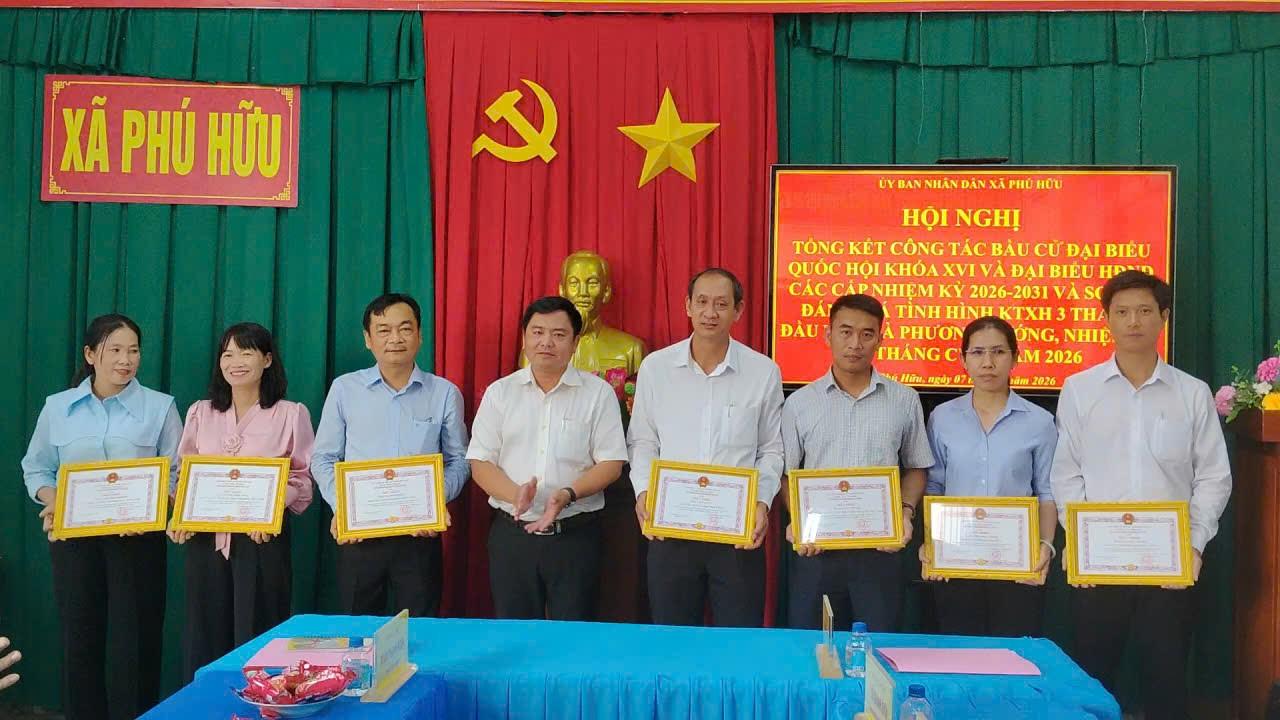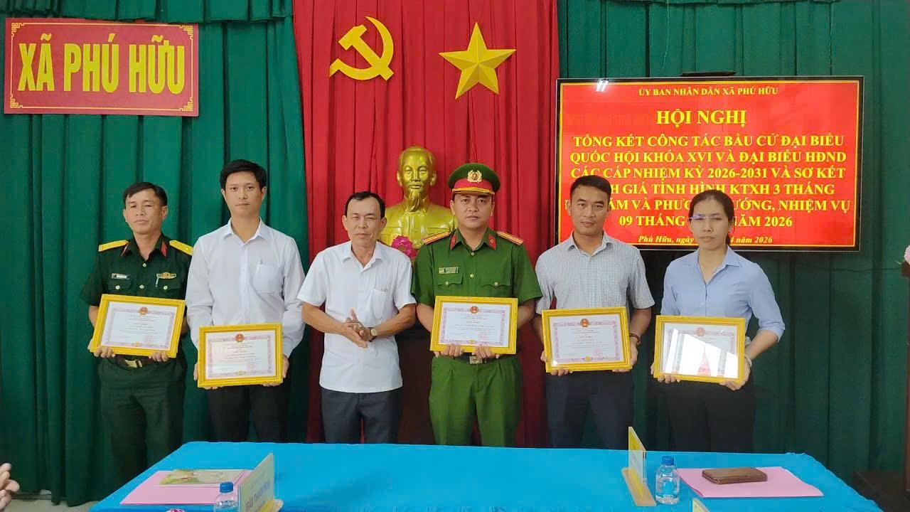 Nhân dịp này, UBND xã Phú Hữu khen thưởng cho 10 tập thể và 53 cá nhân có thành tích xuất sắc trong công tác bầu cử đại biểu Quốc hội khóa XVI và đại biểu HĐND các cấp, nhiệm kỳ 2026 – 2031.