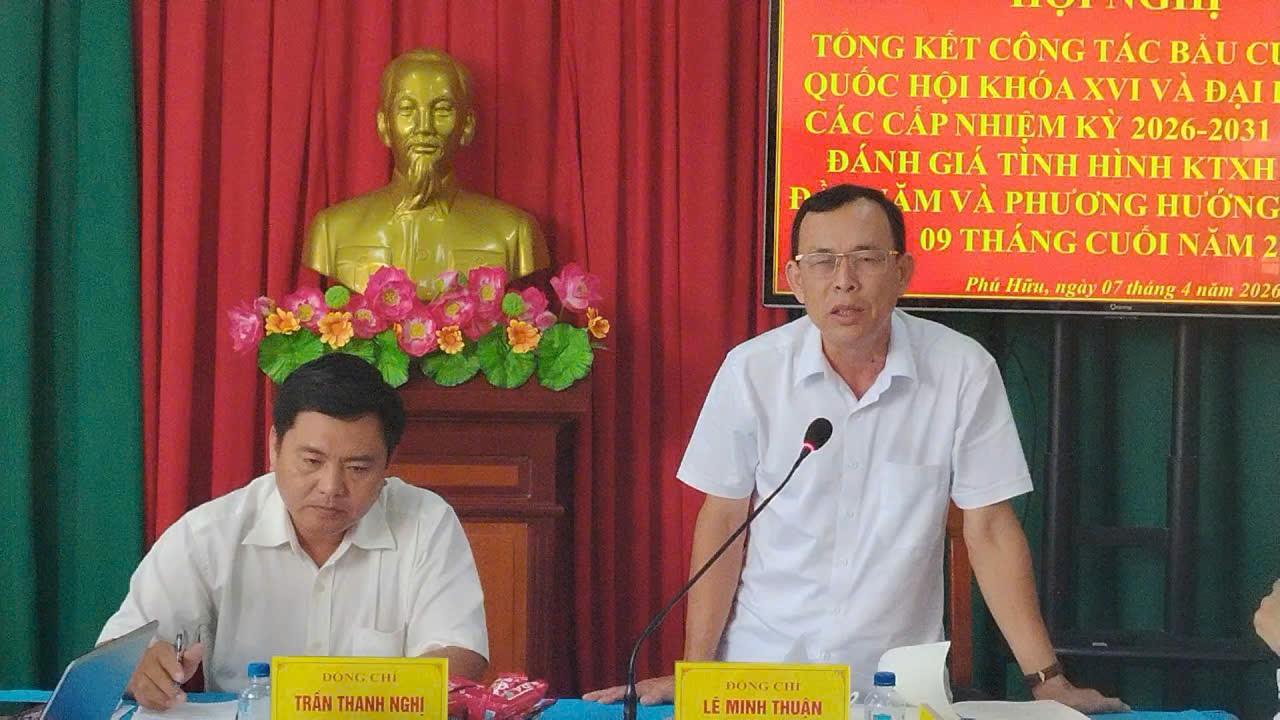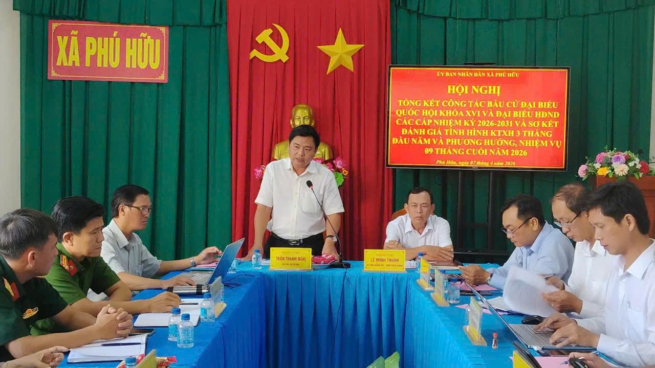 Chiều 07/4, UBND xã Phú Hữu tổ chức hội nghị tổng kết công tác bầu cử đại biểu Quốc hội khóa XVI và đại biểu HĐND các cấp, nhiệm kỳ 2026 – 2031; sơ kết đánh giá tình hình kinh tế - xã hội 3 tháng đầu năm và triển khai phương hướng, nhiệm vụ 9 tháng cuối năm 2026. Tham dự hội nghị có Bí thư Đảng ủy, Chủ tịch HĐND xã Lê Minh Thuận; Phó Bí thư Đảng ủy, Chủ tịch UBND xã Trần Thanh Nghị chủ trì hội nghị.