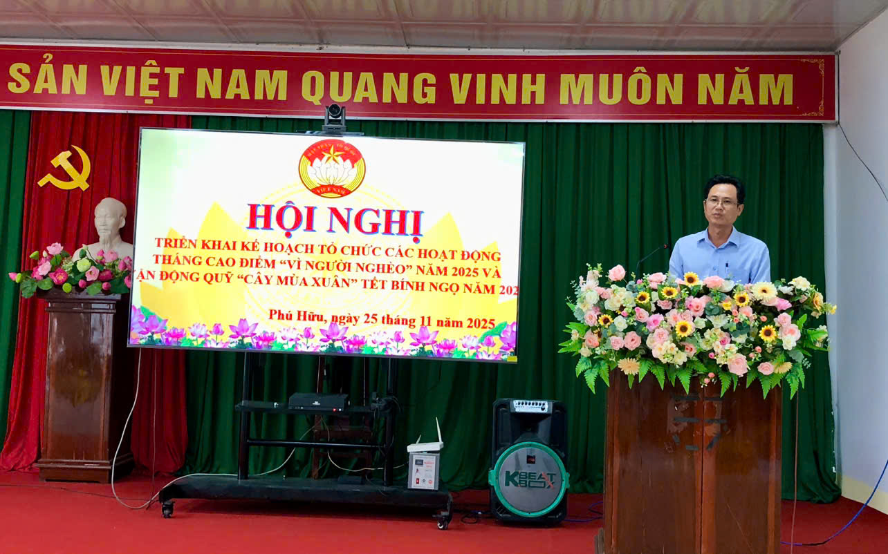 Chiều 25/11, Ủy ban Mặt trận Tổ quốc Việt Nam xã Phú Hữu tổ chức hội nghị triển khai Kế hoạch tổ chức các hoạt động Tháng cao điểm “Vì người nghèo” năm 2025 và vận động Quỹ “Cây mùa xuân” Tết Bính Ngọ năm 2026. Phó Bí thư Thường trực Đảng ủy Phùng Thế Vinh đến dự và chỉ đạo hội nghị.