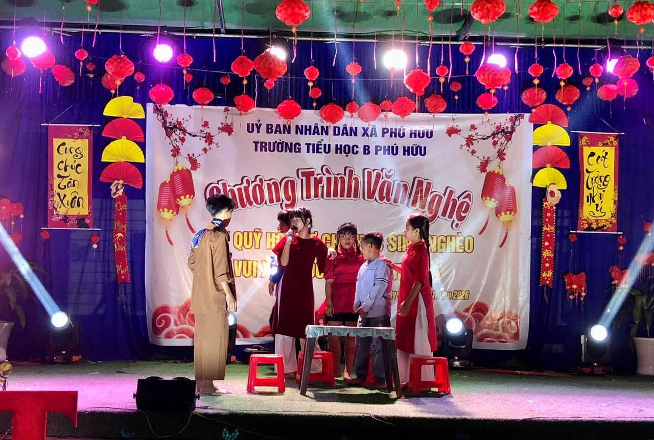 Tối 31/1, Trường Tiểu học B Phú Hữu tổ chức đêm văn nghệ gây quỹ ủng hộ học sinh nghèo với chủ đề Mừng Đảng – Mừng Xuân Bính Ngọ năm 2026. Chương trình diễn ra trong không khí vui tươi, ấm áp nghĩa tình, thu hút sự quan tâm, tham dự của đông đảo cán bộ, giáo viên, phụ huynh học sinh và Nhân dân địa phương.
