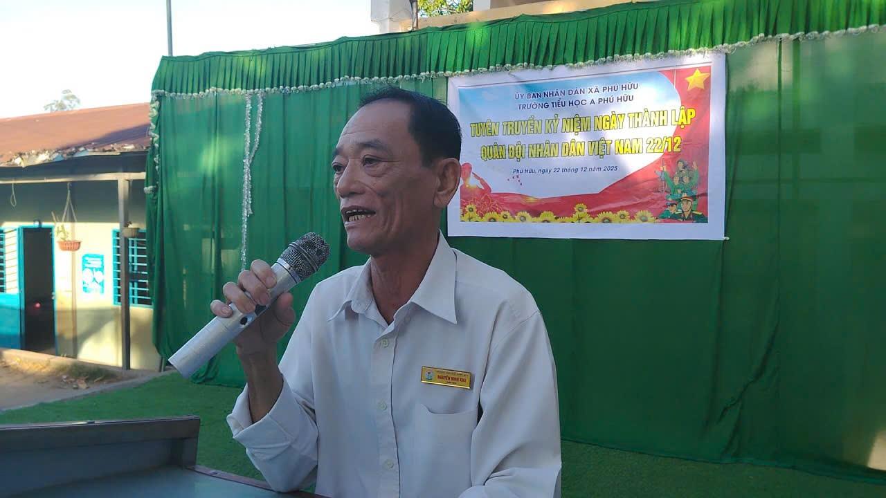 Nhân kỷ niệm 81 năm Ngày thành lập Quân đội Nhân dân Việt Nam (22/12/1944-22/12/2025) và 36 năm Ngày hội Quốc phòng toàn dân (22/12/1989-22/12/2025), sáng 22/12, Trường Tiểu học A Phú Hữu tổ chức buổi tuyên truyền dưới cờ kỷ niệm Ngày thành lập Quân đội Nhân dân Việt Nam cho toàn thể cán bộ, giáo viên và học sinh của trường. Đến dự có ông Mai Văn Tính, Phó Chủ tịch UBMTTQVN, Chủ tịch Hội Cựu chiến binh xã Phú Hữu.