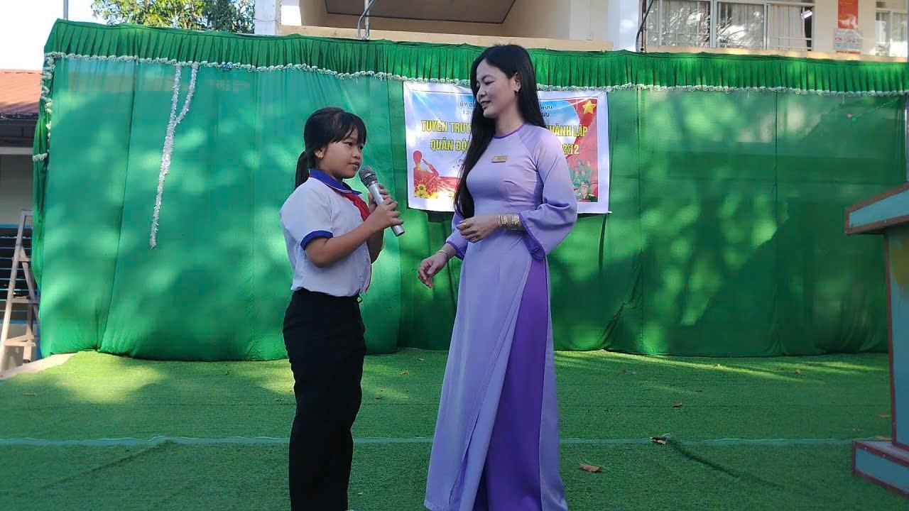 Thầy Nguyễn Kinh Kha, đại diện Ban giám hiệu trường Tiểu học A Phú Hữu tuyên truyền nội dung Ngày thành lập Quân đội Nhân dân Việt Nam