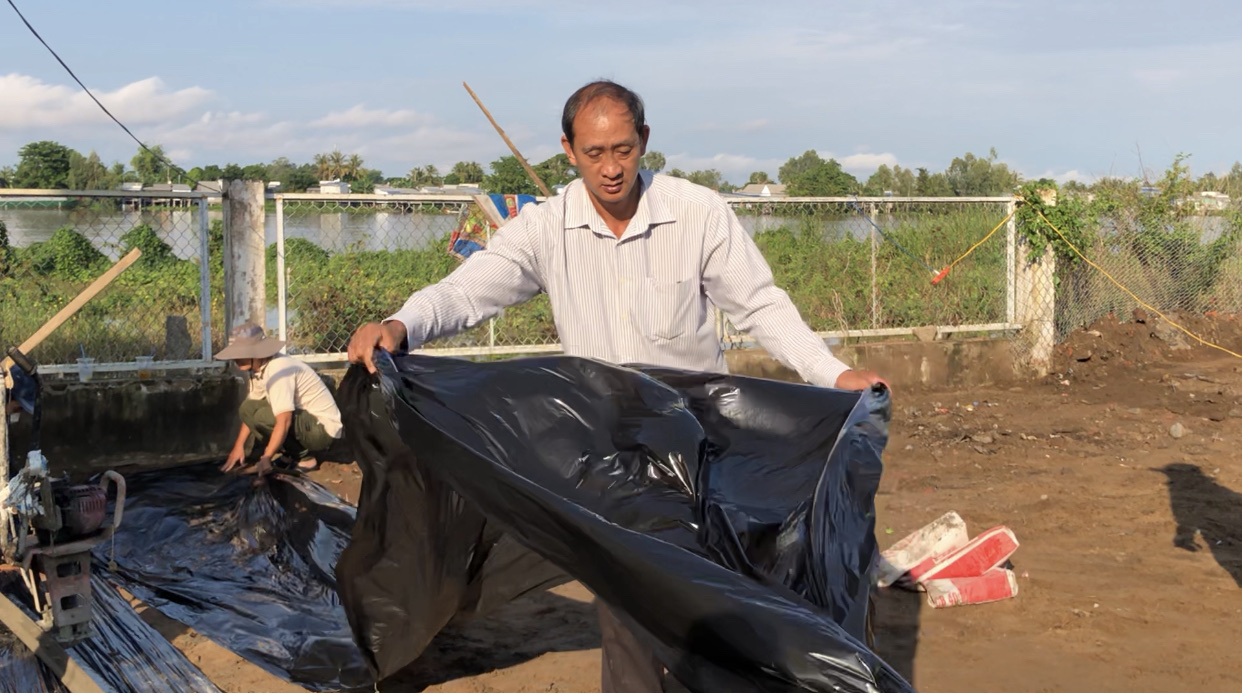 Ông Võ Văn Dừa, Phó Chủ tịch UBND xã Phú Hữu tham gia đổ bê tông cùng các lực lượng