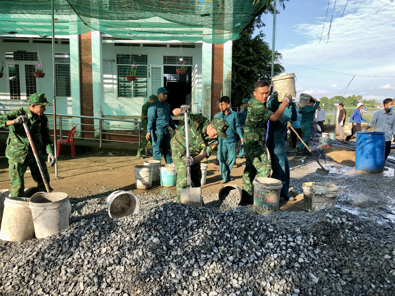 Lực lượng vũ trang trên địa bàn xã vận chuyển đá đổ bê tông