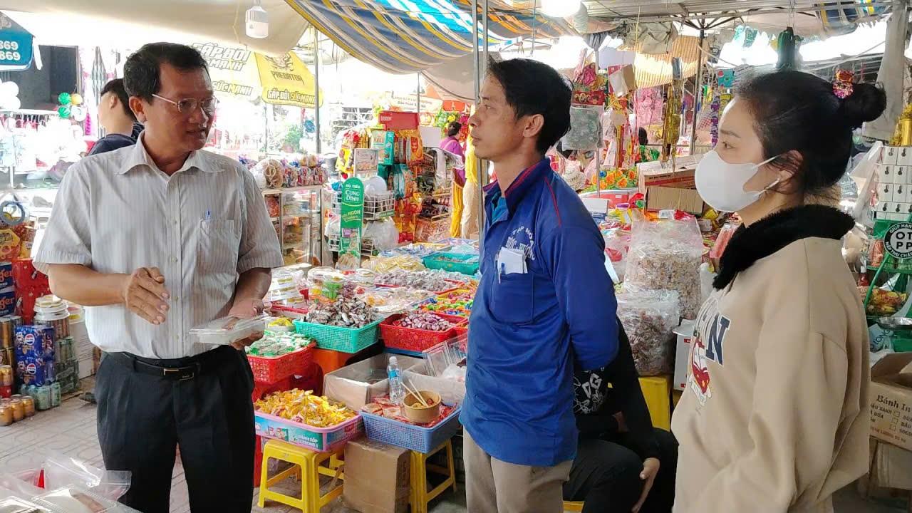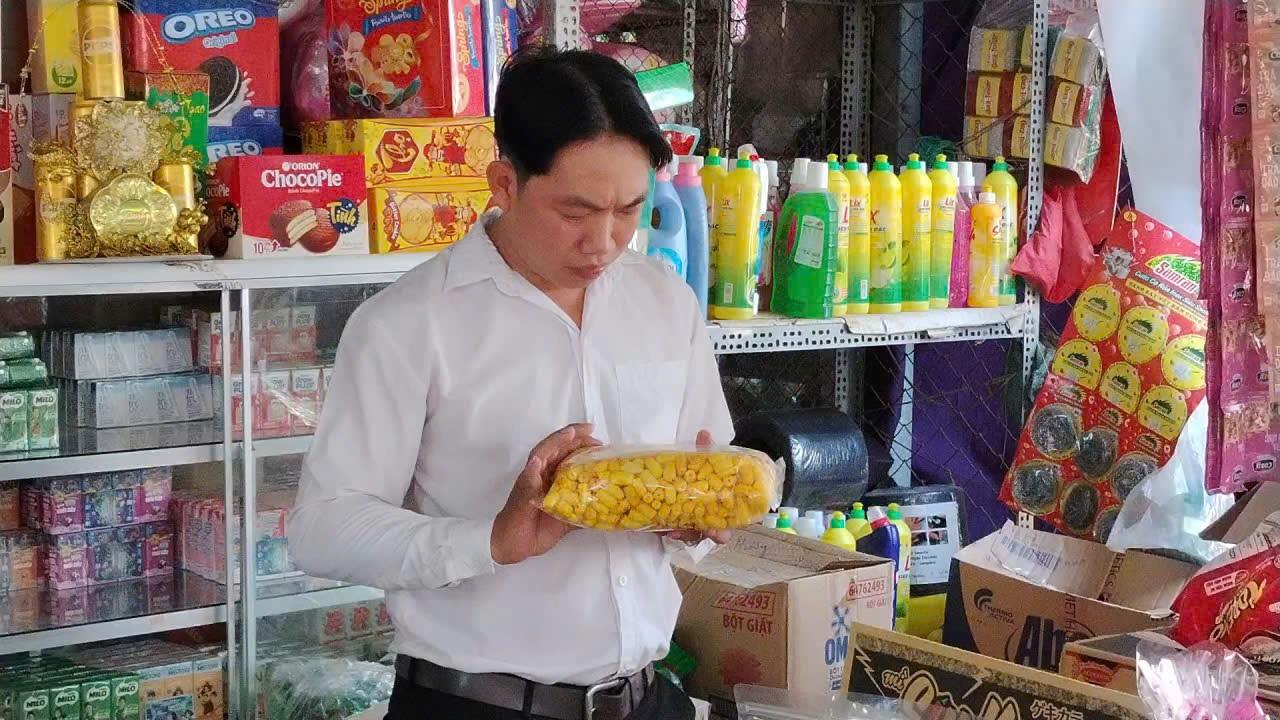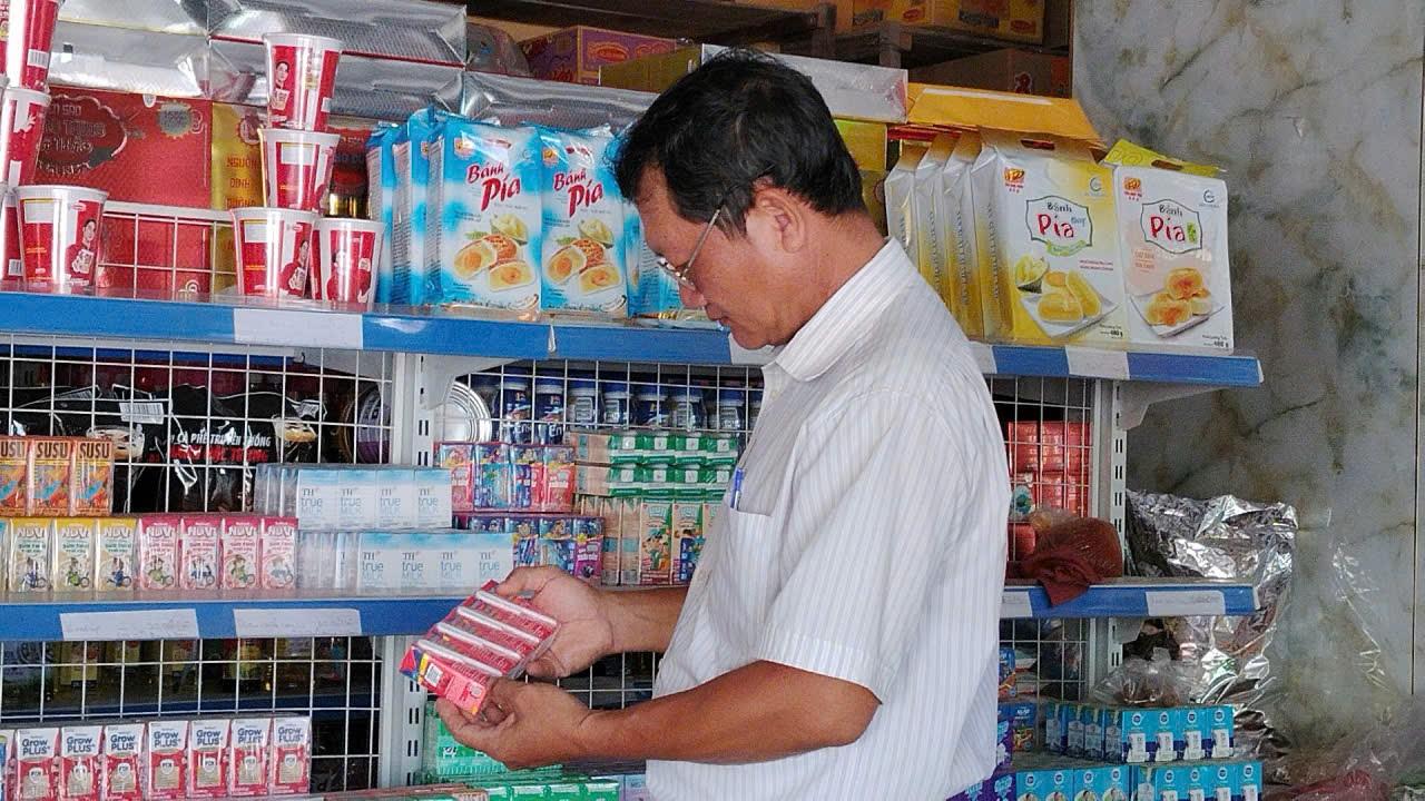 Kiểm tra thời hạn sử dụng mặt hàng thực phẩm tại cửa hàng tạp hóa trong khu vực chợ Phú Thạnh